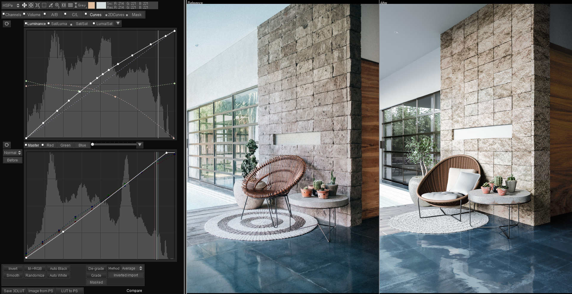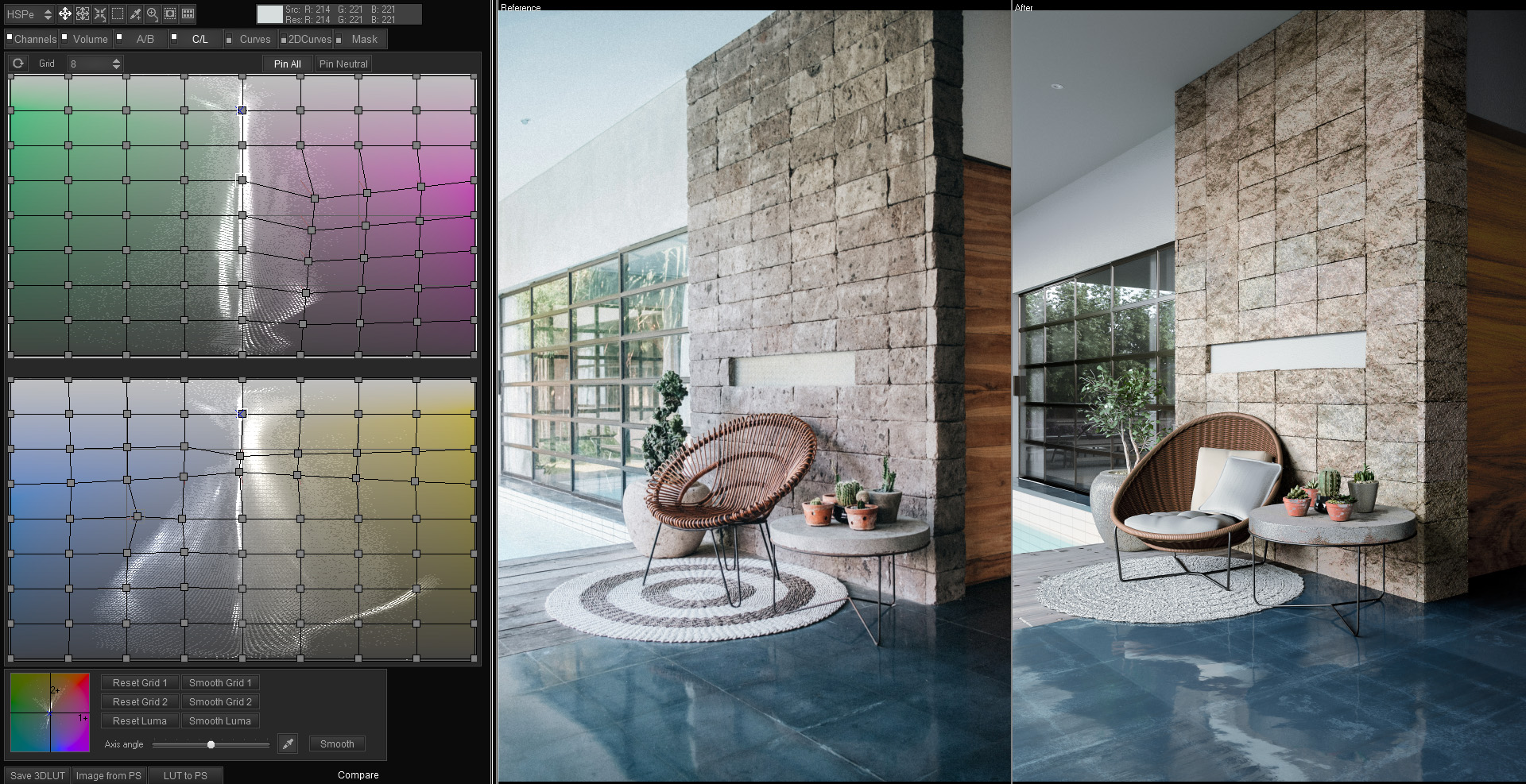 To get a better understanding on how the sliders work you should watch this video. Instantly its closer however some colors have shifted into the green such as the wall. You will also notice the colors on the top left hand grid have shifted so we can select the areas on the wall or ceiling and move them to be warmer. I have also done this manually on the floor to get that nice blue color. Depending on which window you are in (we are currently in the AB tab), you can just select an area of your image and drag it. When you are in AB mode we can affect color directly, you can also switch to other modes such as the Curves and adjust luminance separately, hue, saturation or separate channels. You can see a few more adjustments I have made in the Channels, Volume, AB, CL, and Curves area for fine tuning.