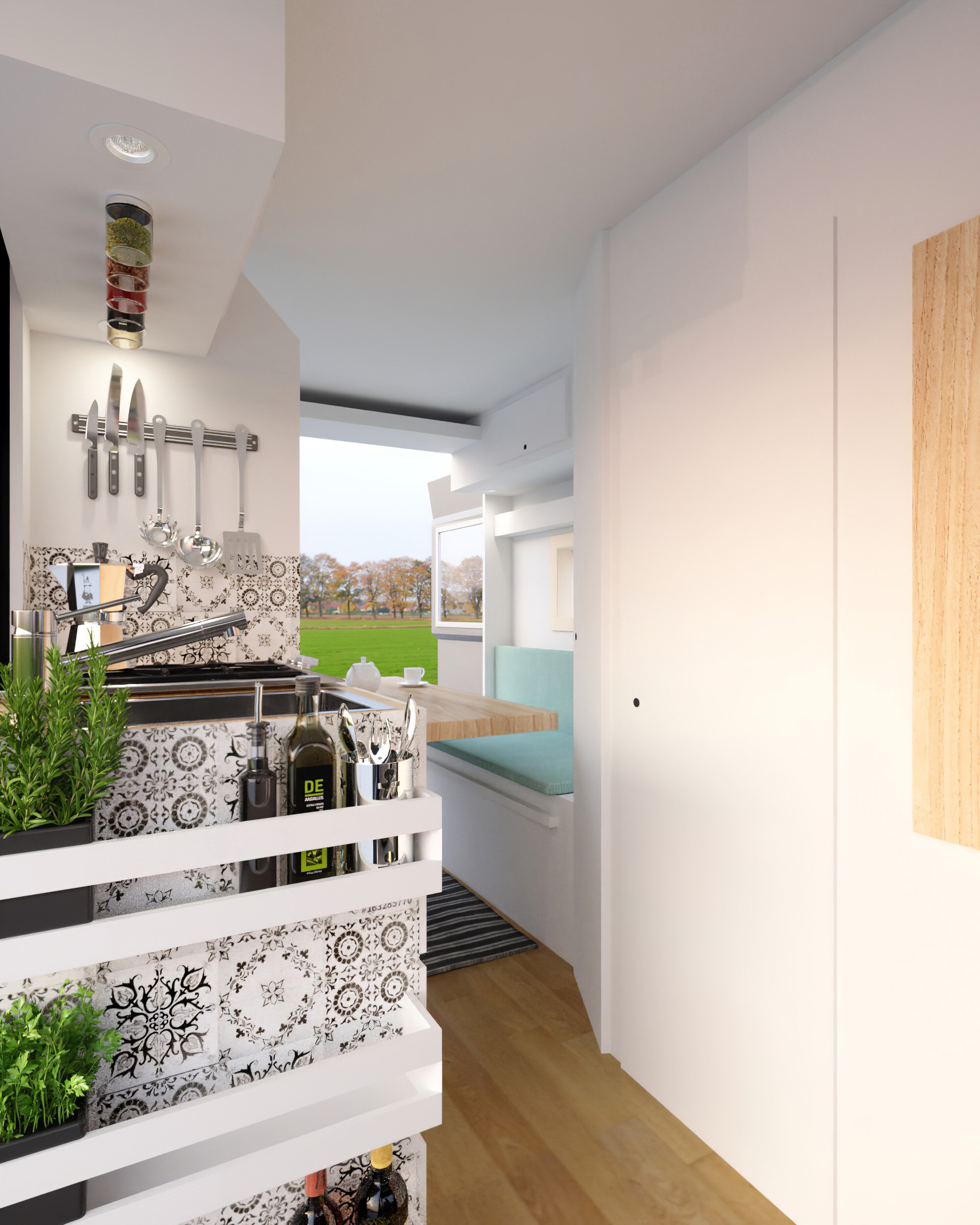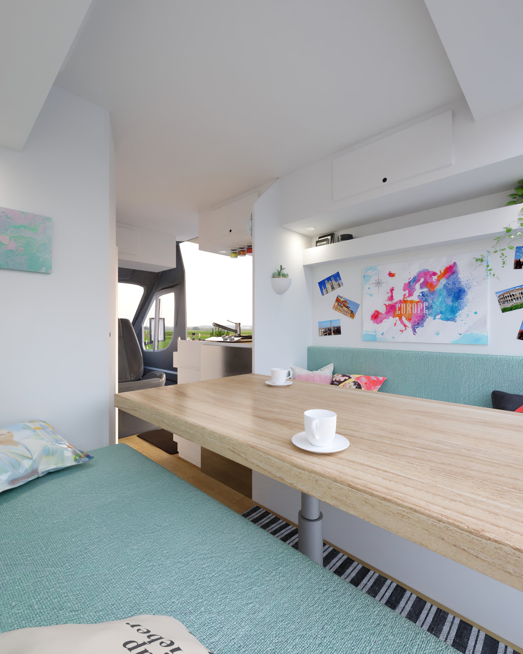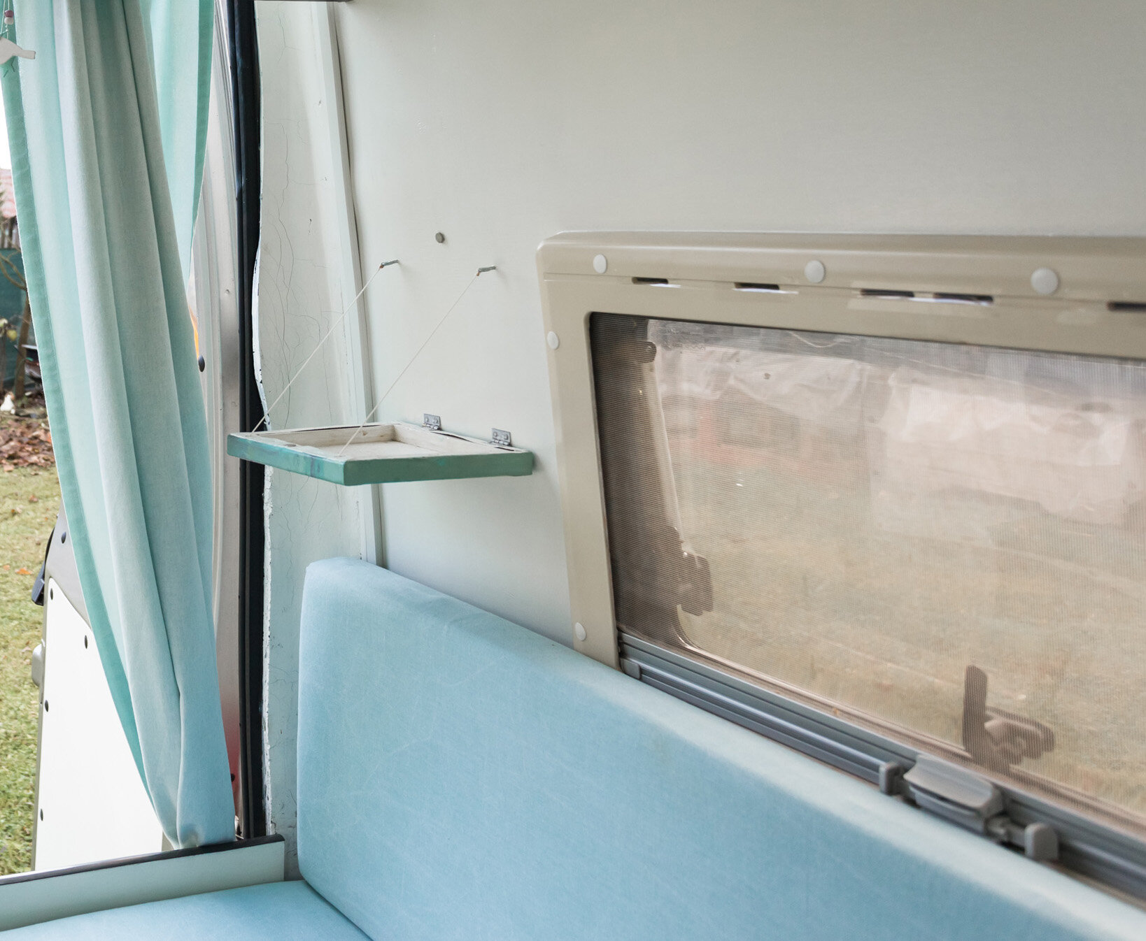 We installed a table that can be converted to a bed, removed the walls and floors for insulation and a timber laminate floor, built new shelves for the kitchen/living area and repainted the entire interior. We also built a fold up table that can be used for dining, a work area for the laptop or a drying rack for the dishes – as its built on the kitchen wall and the passenger chair can rotate around to use it as well. Kate hand-crafted the fruit net, we cut a magnet strip for knives, a spice rack above the stove and she turned one of her paintings into a fold out table that can be used for coffee while lying in bed.