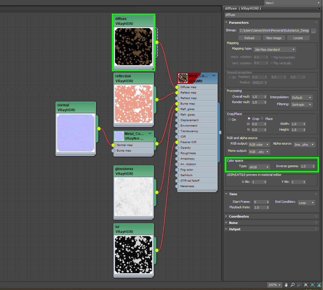 Lets start with our basic input of texture maps and see the result. Only Diffuse & Reflection will have the Input Gamma as Automatic and the rest of your maps will require you to Override the Input to 1.0 as shown below.