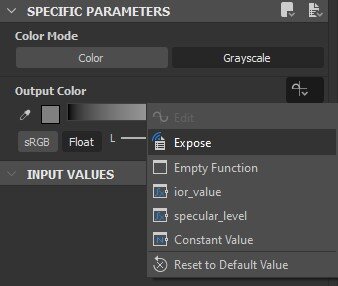 To show you how you can set this up for yourself in Substance Designer select your Greyscale Node > Output Color > Expose (function). You can then set a name like ior_value.