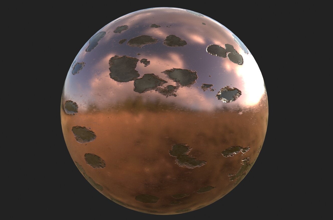 Lets do this with something that seems reasonably simple: A Metal Copper Sphere (Conductor/Metal) with some light glossiness and some chunks removed to reveal the surface below (Dialectric).