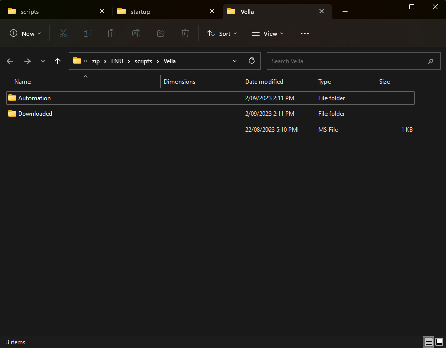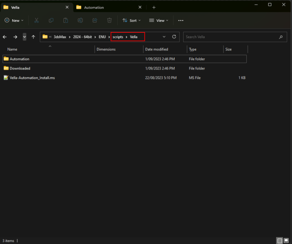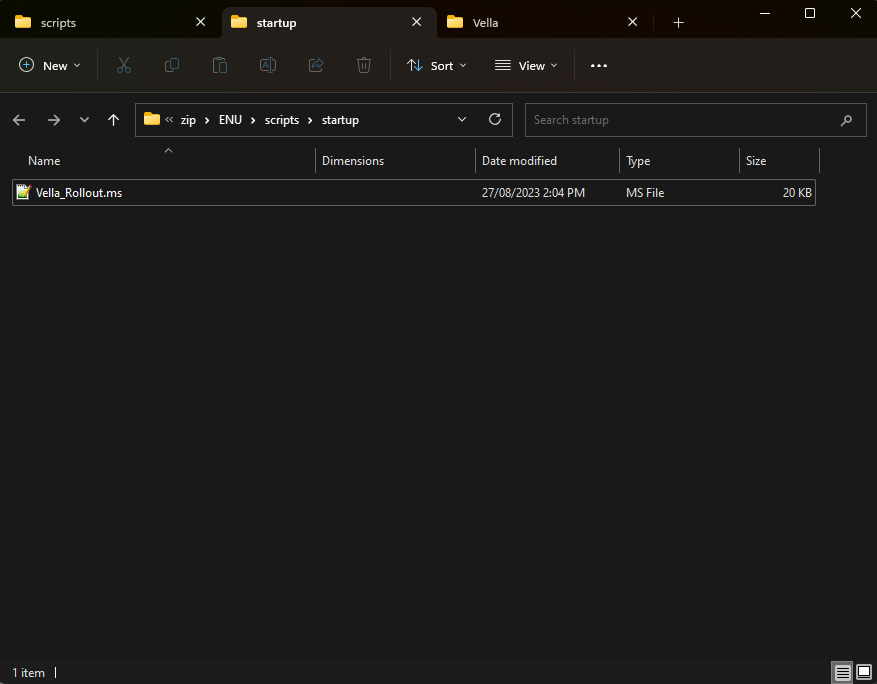 I have one script in my \ENU\scripts\startupfolder – Vella_Rollout.ms. This is the script that we wrote in Part 1 and will call the rest of our scripts. My other scripts are located in a folder I made \ENU\scripts\Vella