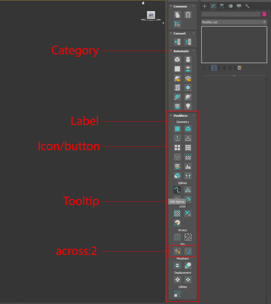Modifiers has labels such as: Geometry, Splines, UVW etc.